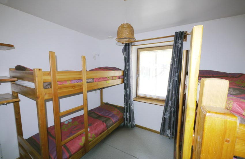 Une chambre avec un lit double et une chambre avec 4 lits simples superposés.